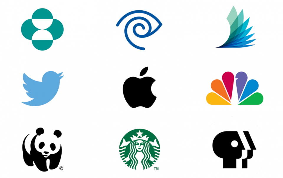 抽象徽標的示例包括:Merck Sharp & Dohme BV、時代華納有線、Darien Library、Twitter、Apple、NBC、世界野生動物基金會、星巴克和 PBS。